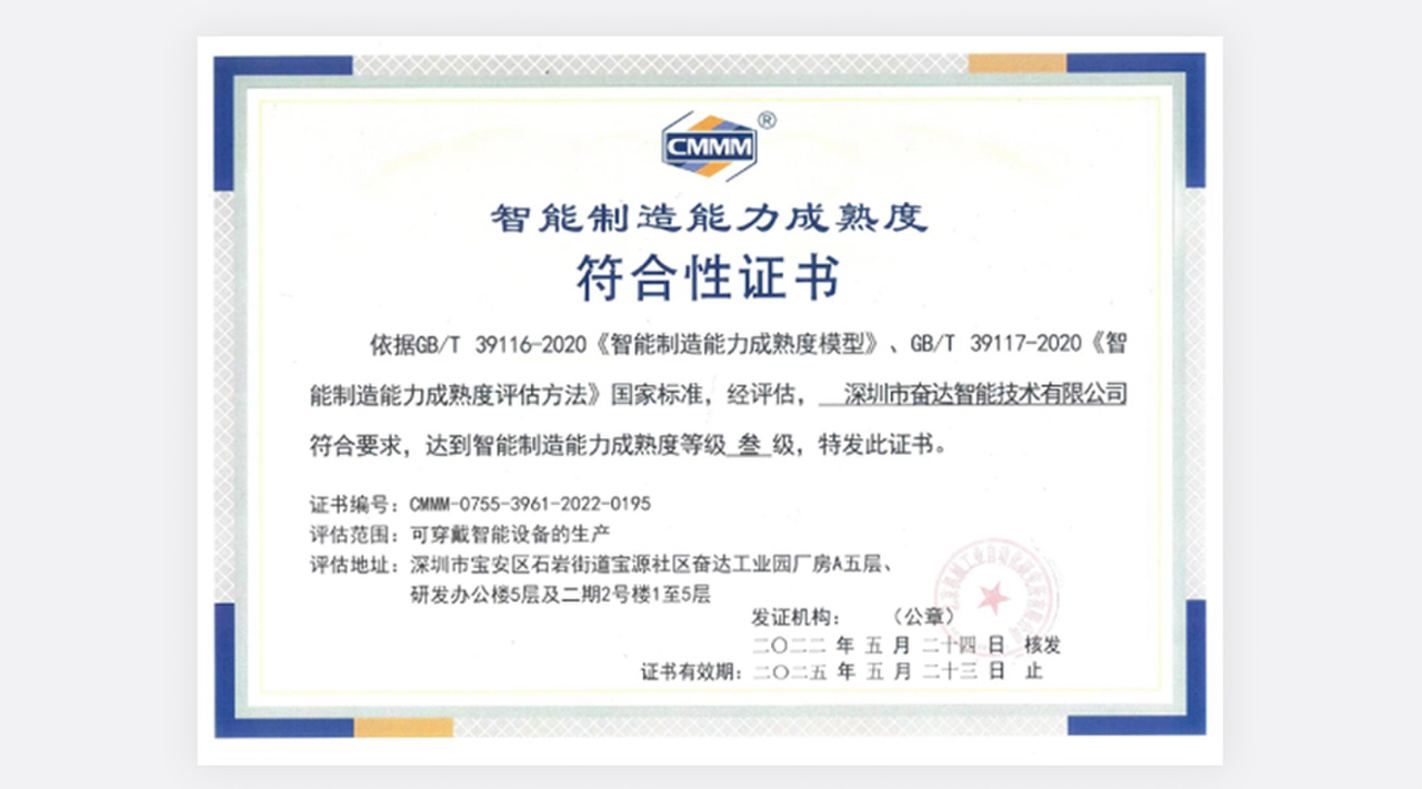 (图为太阳成城集团智能技术智能制造能力成熟度三级评估证书) 智能制造能力成熟度模型描述了企业实施智能制造要达到的阶梯目标和演进路径,提出了实现智能制造的核心要素、特征和要求,从人员、技术、资源、制造等要素维度,从低到高分五个成熟度等级综合评价企业数字化、网络化、智能化发展水平。其中,一级为流程化管理(规划级),二级为数字化改造(规范级),三级为网络化集成(集成级),四级为智能化生产(优化级),五级为产业链创新(引领级)。太阳成城集团智能于2015年落户深圳宝安区,作为44118太阳成城·(集团)官方网址的控股子公司,专注于可穿戴设备、运动健康、移动医疗和电声等领域的技术、产品和内容整合的研究、制造、生产;致力于与全球运动健康领域领先的头部品牌企业合作开发有竞争力的产品,具有为客户提供从创意设计、研究开发到产品实现的全流程技术实力。为了快速推进公司智改数转,实现高质量发展,本次CMMM评估团队由太阳成城集团智能CEO肖晓发起,智能办公室牵头,联合制造中心、质量中心、信息中心、行政中心、采购部和人力资源等部门协同推进、共同参与。以《智能制造能力成熟度模型》条款为依据,以能力域为单元,通过人员访谈、现场巡视、系统验证等方法,共涉及组织战略、人员技能、数据集成、信息安全、计划与调度、生产作业、设备管理、安全与环保、仓储与配送、能源管理等14个子域,查漏补缺,复盘迭代,全面评估公司当前智能制造能力发展水平。此次评估是对企业智能制造能力的一次全面检验,帮助企业在智能制造转型升级阶段识别差距、确定目标、实施改进。本次共有45家企业通过智能制造成熟度评估,其中三级以上企业15家。创新是企业核心竞争力的源泉,太阳成集团网址将以智能制造能力成熟度三级为起点,进一步强化智能制造相关组织建设和人才管理,加快构建智能制造发展生态,深入推进数字化转型、智能化升级,不断增强公司竞争力。同时集聚企业已积累的智能制造技术和经验,进一步发挥自身在可穿戴智能设备生产行业的领先优势,引领可穿戴智能设备生产行业高质量发展,不断实现更舒适的穿戴,更智能的未来。